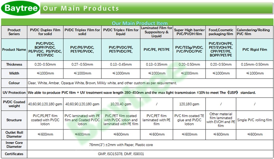 BAYTREE packaging focus on below film foil which using for pharma, food and cosmetics packaging: